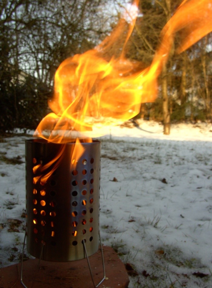 Bild 04: Mein Ultraleicht-Kochset, hier noch mit einer normalen Konservendose zu sehen. Der Kocher selbst, einschließlich Ständer und Topfhalter, wiegen 80 g. Die Konservendose, dreiviertel Liter Inhalt, als Topf mit Deckel nochmals 75 g. Verwendet man hingegen einen Halben-Liter-Alu-Behälter, einschließlich Deckel reduziert sich das Topfgewicht auf ganze 20 g. Insgesamt muss ich dann ein Kochset mit insgesamt 100 g tragen. Weil ich keinen Brennstoff mitschleppen muss und mein Heizmittel, zumindest in Europa, für beliebig langes Kochen unbegrenzt vorhanden ist, halte ich mein Ensemble für wirklich ultraleicht! Bei „ultraleicht“ kommt es auf die Gesamtkonfiguration an, nicht nur auf den Kocher allein. Verbesserungen werden von mir laufend realisiert. Zum Beispiel: keine Schüröffnung (unnötig, weil Nachfüllung von oben), dafür mehr Lüftungslöcher (Vorteil: Glut kann nicht herausfallen).