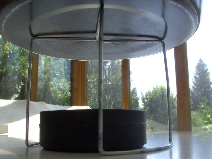 Bild 3: „Ultraleicht-Topfständer“, Höhe 80 mm, Auflage-Durchmesser 105 mm, für den Rucksack, hier mit 1,0-l-Schüssel und Dosenkocher - Durch das minimale Gewicht von nur 23 g geht natürlich etwas von der Stabilität verloren. Wenn man die Fragilität des Topfständers beim Umrühren aber im Auge behält, ist er zum Kochen durchaus geeignet (siehe dazu die Erklärungen zu Bild 8). Von mir persönlich wird diese Art von Topfständer überwiegend zum Erhitzen von Wasser bevorzugt, weil das notwendige Umrühren beim Kochen entfällt.