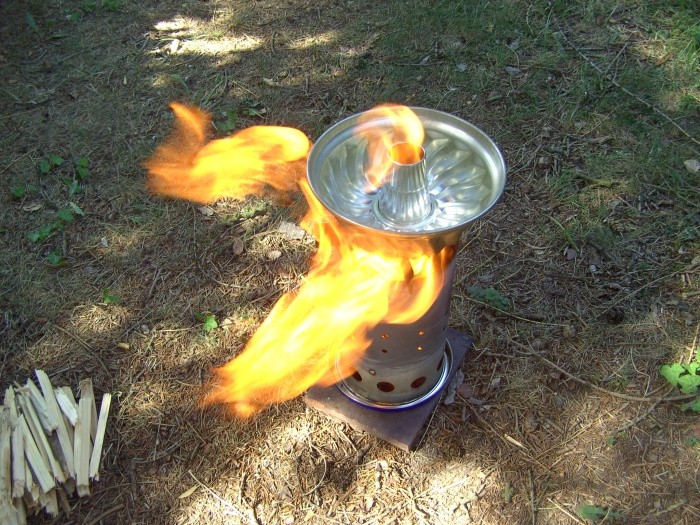 Hinweis: Bei einem Holzfeuer wird das Brennholz über den Kamin nachgeschürt. Die Länge des Holzes soll kleiner als die Höhe des Hobo-Ofens sein, damit er nicht verstopft. Der Deckel dient zugleich als Schutz, dass beim Nachlegen kein Brennmaterial in das Kochgut fällt.