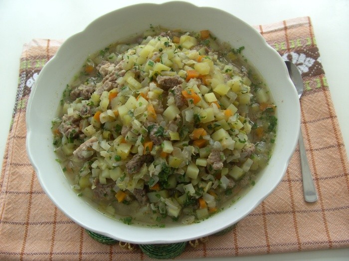 Fleisch, Gemüse, Kartoffel, Pilze sollten ungefähr im gleichen Verhältnis gemischt werden. Dies ist aber in keiner Weise bindend! Je nachdem was ich bekomme - alles landet im Topf, allerdings sollte keine Zutat zu stark dominieren.